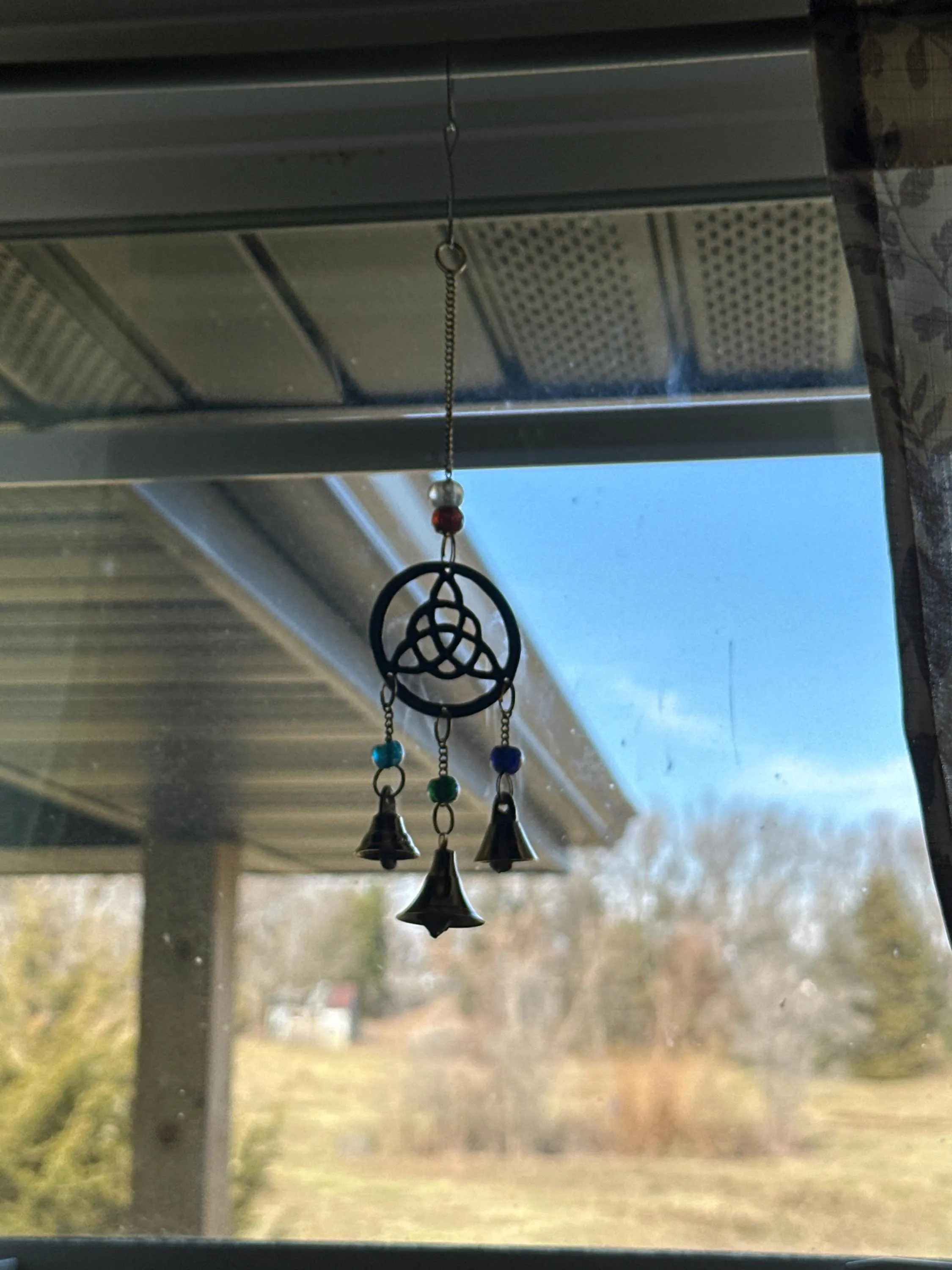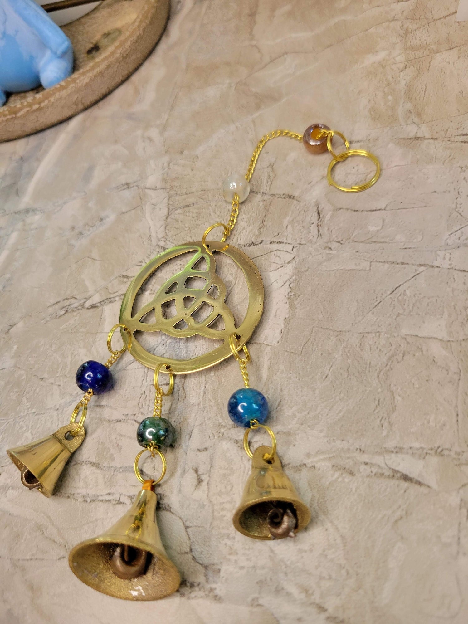 Handmade brass wind chime with bells and beads triquetra witch bells
