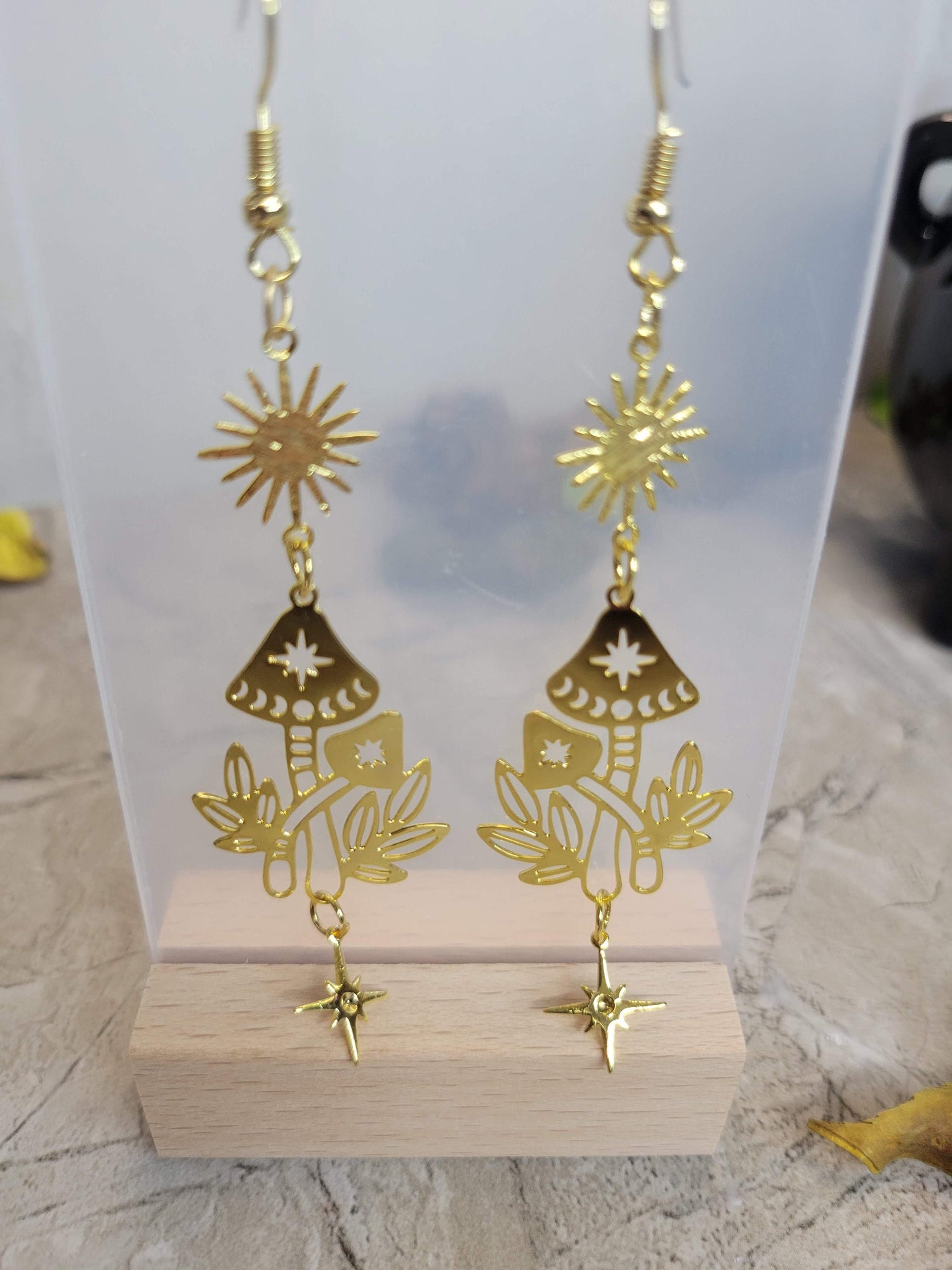 Add a touch of celestial elegance to your ensemble with these Celestial Mushroom Earrings. Crafted carefully, the ethereal design, delicately suspended sun and star charms. These enchanting earrings are perfect for celestial admirers and lovers of natural beauty.
