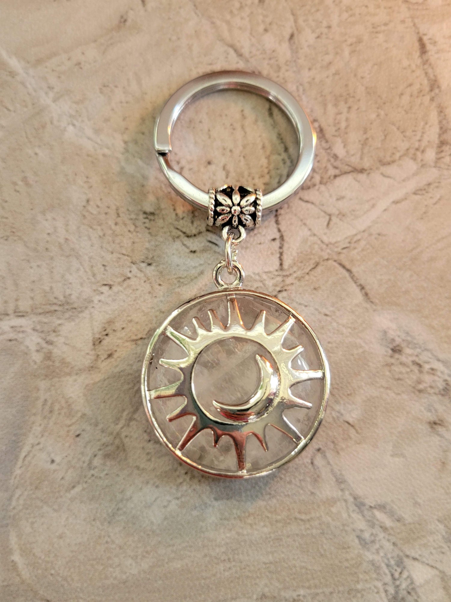 Natural quartz crystal keychain, flat round with sun & moon