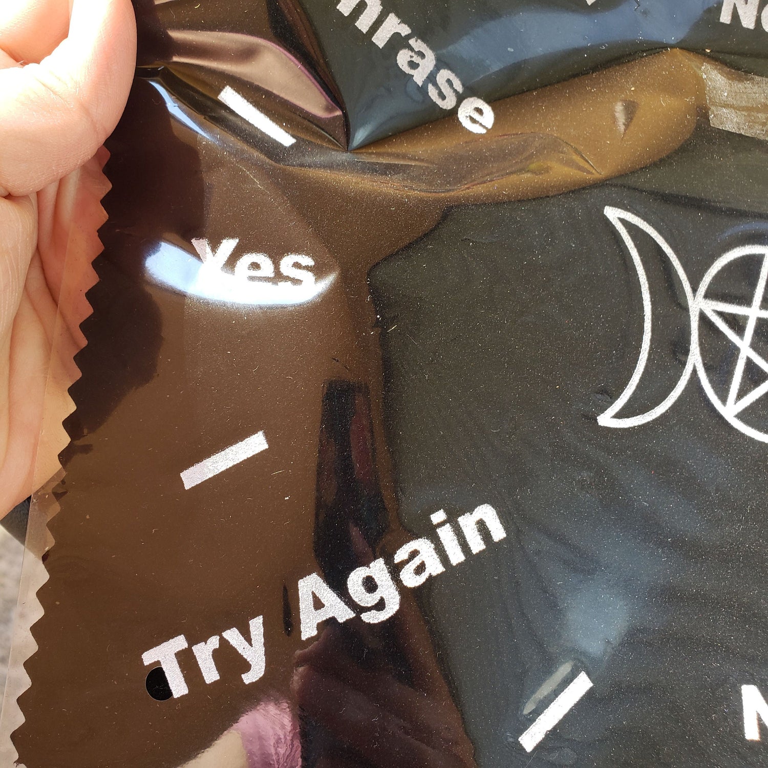 Triple Moon Pentagram in middle of this Black Velvet Pendulum Mat with silver print. Use this Mat as a guide for the answer to your query. Size 8 x12" approximately may little vary.